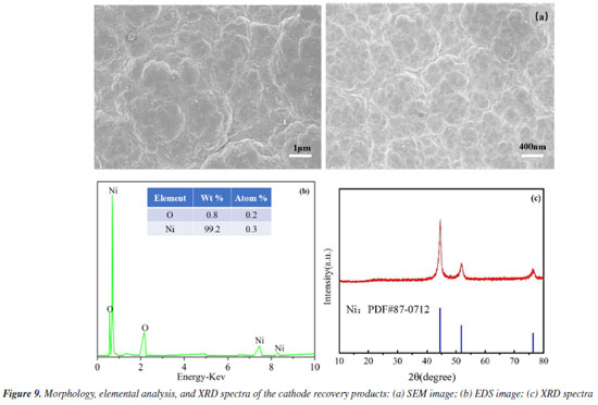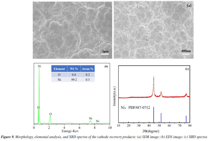This degradation releases nickel ions into the solution, increasing the concentration of free Ni2+. These ions are then transported to the cathode by the electric field (Equation 7).35 When free nickel ions at the cathode come into contact with OH-, they react to generate Ni(OH)+ compounds on the cathode surface (Equation 8). It can also bind selectively to excess nickel ions, making it easier for Ni to be deposited (Equation 10) and effectively recovering the nickel. These Ni(OH)+ are reduced to Ni(OH)ads in the subcritical state (Equation 9), which are then further reduced to precipitate as monomeric nickel (Equation 11). The hydrogen precipitation reactions on the cathode surface also raise pH of the cathode. (Equation 12). Additionally, Ni(OH)+ compounds are more likely to develop on the cathode surface when the pH rises (Equation 8). These Ni(OH)+ compounds gradually degrade over time, first creating monomeric nickel as well as Ni(OH)2 in the presence of OH- (Equation 13). It is worth noting that the EOSE system continuously creates H+ ions, causing the pH of the cathode to rise due to the hydrogen precipitation reaction, before falling again as the reaction progresses. Thus, Ni(OH)2 is further reduced to create monomeric Ni or NiOOH (Equations 14 and 15).36 ![]() Following electrolysis, the deposition products were collected at the stainless steel cathode and analyzed using SEM-EDS, XRD, and XPS. The SEM images of the deposit are shown in Figure 9a. The deposit is closely arranged in irregular ellipsoidal shapes with rough grains and uneven porosity, corresponding to metallic nickel.37 Meanwhile, Figure 9b shows the EDS spectra of the deposit on the cathode following the electrocatalytic oxidation and electrodeposition reactions. As can be seen, Ni and O are the major components of the deposit, accounting for 99.2 and 0.8%, respectively, indicating that the deposition product on the stainless steel cathode is 99% pure metallic nickel. Physical studies of the recovered compounds were performed using XRD in the temperature range of 10-80 ºC. As shown in Figure 9c, distinct diffraction peaks at 2θ values of 44.80º, 52.75º, and 77.52º correspond to the crystal planes (111), (200), and (220), respectively. These peaks are indexed to the standard monoclinic Ni phase (Joint Committee on Powder Diffraction Standards, JCPDS No. 87-0712),38 reflecting the dominance of nickel and confirming the face-centered cubic structure of the Ni phase.25 No other impurity peaks are observed, indicating that the deposited nickel has high crystallinity.