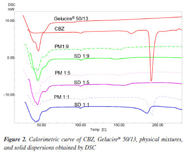 Figure 1b shows the thermogravimetric behavior of Gelucire® 50/13, with the percentage of mass loss under the same conditions applied to CBZ. Gelucire® 50/13 exhibited a single decomposition stage, starting at 324.12 ºC and ending at 408.43 ºC, with a mass loss of 98% and a final residual mass of 2%. In conclusion, the thermogravimetric analysis clearly indicates that both CBZ and Gelucire® 50/13 are stable at temperatures below 200 ºC, undergoing no decomposition. Therefore, the solid dispersion preparation process does not alter the chemical composition of these constituents. DSC analysis The DSC technique was employed to detect possible interactions between CBZ and Gelucire® 50/13 by analyzing their physical mixtures and to determine if the solid dispersion preparation process led to any changes in the thermal profile of their components. Figure 2 shows the calorimetric profile of Gelucire® 50/13. The calorimetric analysis of this polymer revealed a single endothermic peak at 45.49 ºC with a broad melting range, characteristic of such compounds. In contrast, CBZ exhibited two initial peaks indicative of an endothermic event. The first, a small peak, corresponds to the fusion of the β form or form III at 167 ºC, followed by a second peak corresponding to the fusion of the α form or form I at 192 ºC. A third event, an exothermic peak, occurs around 230 ºC.12