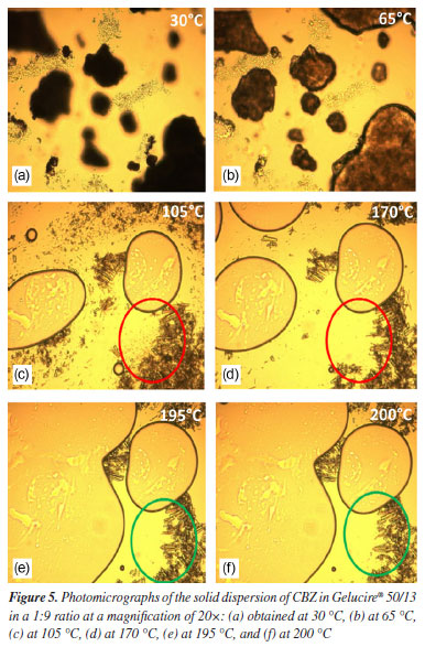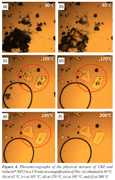 In Figure 3, the diffractogram of the carrier (Gelucire® 50/13) shows typical triglyceride peaks observed at 19.1 and 23.2º (2θ), known as short spacing.17 In the diffractogram of the 1:9 physical mixture, it is evident that no new peaks appeared that could be attributed to any of the polymorphic forms of CBZ. The peaks correspond to the original drug (form III), with the two most intense peaks being those of the carrier. In the diffractogram of the 1:9 solid dispersion, new peaks emerged at 2θ angles of 5.0 and 8.9º. These peaks characterize the polymorph I or α, which is likely formed during the preparation of the solid dispersion when the drug is subjected to heating (70 ºC) for a certain period. Therefore, the solid dispersion is probably composed of a mixture of polymorphs III and I.18 According to the literature,19 CBZ polymorph I can be obtained by heating form III. Thus, the production process of CBZ solid dispersion possibly promotes the transformation of a portion of form III into form I due to the heat supplied during the polymer melting process. This phenomenon is extremely important concerning the stability of the solid dispersion. Under storage conditions, form I tends to convert back to form III due to the enantiotropic phenomenon.20 These two forms differ significantly due to variations in their free energies,21 which lead to differences in their physicochemical properties, including solubility, potentially affecting the in vitro release profile. For instance, it was demonstrated that the dissolution rate of form I was higher than that of form III.22 Due to this factor, selecting appropriate storage conditions for solid dispersions is essential to ensure their long-term stability. Hot-stage microscopy (HSM) study Hot-stage microscopy (HSM) is an analytical technique that combines the best properties of microscopy and thermal analysis to characterize the physical properties of materials as a function of temperature.23 HSM can be used for the characterization of the solid-state of drugs, evaluation of crystalline forms and hydrates, and other physicochemical properties. The solid dispersion of CBZ in Gelucire® 50/13 at a 1:9 ratio and its corresponding physical mixture were analyzed by HSM, as shown in the photomicrographs presented in Figures 4 and 5.