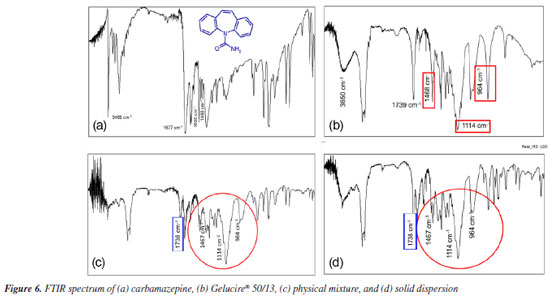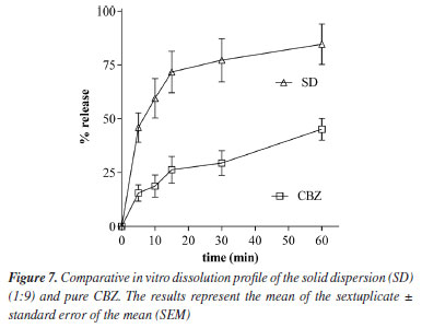 Figure 6b presents the FTIR spectrum of Gelucire® 50/13. Gelucire® 50/13 displayed a broad band between 3650 and 3100 cm-1 due to the stretching of free OH groups, an intense peak at 1739 cm-1 belonging to the C=O group, as well as singlets at 1114 and 1468 cm-1 and a doublet at 964 cm-1, characteristic of polyethylene glycol groups.25 The spectra of the physical mixture and solid dispersion (Figures 6c and 6d, respectively) showed the presence of the same stretching and deformation bands related to CBZ and Gelucire® 50/13. This suggests that no interactions occurred between the drug and polymer functional groups. A potential interaction could involve the hydrogen of the CBZ amide group and the oxygen of the polyglycol chain, inducing a shift in the N-H vibration depending on the degree of interaction. This interaction would also lead to modifications in the C=O group of the polymer, which were not observed. Therefore, neither the solid dispersion production process nor the physical mixture induced modifications in the mentioned peaks. In vitro dissolution study The dissolution profile defines the dissolution rate characteristics of a drug in a solid pharmaceutical form. Dissolution studies are conducted to detect manufacturing deviations in the pharmaceutical formulation, ensure uniformity during batch production, and guarantee batch-to-batch reproducibility. Additionally, they assist in evaluating changes after product registration, aid in decision-making regarding bioequivalence studies, and contribute to establishing in vitro-in vivo correlation.26 Figure 7 shows the dissolution profile of the solid dispersion with CBZ. The dissolution rate of pure CBZ was approximately 25% in 15 min and reached only 45% release in 60 min. In contrast, the solid dispersion exhibited a superior release profile from the beginning of the dissolution process, reaching approximately 85% in 60 min. This increase in the dissolution profile of the solid dispersion compared to pure CBZ is possibly explained by an intensified solubilization effect provided by the carrier, which accelerates the solubilization process by increasing the wettability of the drug.
