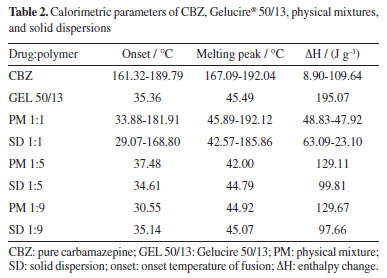 CBZ shows enantiotropic polymorphism, meaning that there is a transition temperature below the melting points of both polymorphs, at which they have the same free energy and can convert between each other. Above this transition temperature, the form I, which has the higher melting point, has the lowest free energy and is more stable. Below this transition temperature, however, the form III, which has the lower melting point, has the lowest free energy and is therefore more stable. The transition temperature of the enantiotropic form of CBZ is around 71 ºC. Therefore, at room temperature, form III is the most stable form. Consequently, the endothermic peak observed at 167 ºC in the experiment indicates that the CBZ analyzed is in form III,13 and the peak corresponding to form I occurred due to the DSC analysis process itself. This result is supported by X-ray diffraction data of the powders. The calorimetric profile of the solid dispersions and physical mixtures of CBZ and Gelucire® 50/13 in different proportions (1:9, 1:5, and 1:1) and their comparison with the CBZ and polymer profiles are shown in Figure 2. The PM (physical mixture) and SD (solid dispersion) samples with a 1:1 ratio showed both the polymer and drug fusion peaks. Due to the reduced amount of CBZ in the 1:5 and 1:9 ratios, the CBZ fusion peak was not detected, and only the polymer fusion peak was observed (Table 2).