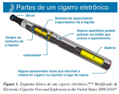 RESULTADOS Cigarros eletrônicos Fumo e exposição Com o objetivo de ampliar a definição e a classificação dos diferentes tipos de exposição aos cigarros eletrônicos, será utilizada uma abordagem adaptada de estudos internacionais originalmente desenvolvida para categorizar o fumo de cigarros convencionais. Serão tratados como exposição primária (firsthand smoke, FHS), exposição secundária (secondhand smoke, SHS) e exposição terciária (thirdhand smoke, THS) os diferentes níveis de exposição citados no trabalho que expandem o conceito de fumo passivo e fumo ativo.8,70,77-83 É definida como exposição primária (firsthand smoke) a exposição direta ao fumo ativo e o contato direto com os produtos tóxicos de um cigarro ou outro DEF. Já a exposição secundária (secondhand smoke), também conhecida como fumo passivo, ocorre pela exposição involuntária pela exalação de fumaça por fumantes ativos ou, no caso do cigarro convencional, pela região em brasa. A exposição terciária (thirdhand smoke) possui um caráter mais ambiental, ocorre pela liberação gradual de resíduos tóxicos do cigarro convencional ou DEF, que permanecem depositados em superfícies, ou como componentes do material particulado (MP) de ambientes fechados.65,70,78,82,84,85 A exposição terciária ocorre por um espaço de tempo prolongado e após as exposições primária e secundária (liberação gradual e continuada). Outro caráter importante é a caracterização dos resíduos, seja pelo fumo de cigarros convencionais ou pelo uso de DEF, como uma categoria expandida da exposição terciária ou pertencente a uma nova categoria (exposição quaternária), dado seu caráter ambiental externo. Funcionamento Os cigarros eletrônicos são dispositivos que simulam o ato de fumar tabaco e são descritos pela Anvisa como Dispositivos Eletrônicos para Fumar (DEF e do inglês Electronic Smoking Devices, ESD) e Sistemas Eletrônicos de Administração de Nicotina (SEAN, do inglês, Electronic Nicotine Delivery Systems, ENDS), englobando de maneira geral, todos os modelos e características de operação dos aparelhos. Um modelo simplificado é mostrado na Figura 1.