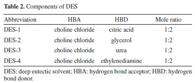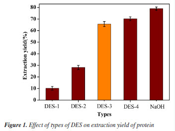RESULTS AND DISCUSSION Screening of DESs Influence of DES types The extraction efficiency of various DESs was evaluated under optimized conditions (30 wt.% water, 20 mL g-1 liquid-solid ratio, 50 °C, 40 min), with pH 9 NaOH as a control (Table 2).21 As shown in Figure 1, DES-3 achieved a protein extraction rate of 66.09 ± 2.82%, lower than DES-4 (70.22 ± 2.13%) and alkaline extraction (78.95 ± 1.68%). Despite its slightly reduced yield, DES-3 was selected for its near-neutral pH (7.2), which minimizes protein hydrolysis, and the generally recognized as safe (GRAS, U.S. FDA)22 status of urea, ensuring food safety compliance. In contrast, DES-4 posed cytotoxicity risks due to ethylenediamine residues.