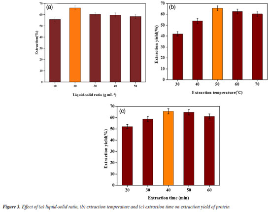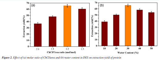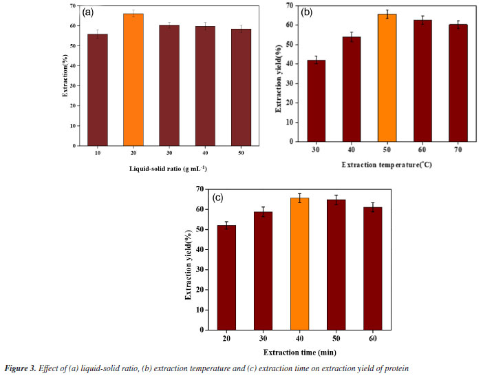 Effect of DES water content The effect of water content in ChCl-urea DES on protein extraction efficiency was evaluated under optimized conditions. As shown in Figure 2b, the maximum extraction efficiency (66.09 ± 2.82%) occurred at 30 wt.% water, where viscosity reduction and lowered surface tension synergistically enhanced solvent penetration.26 Single-factor experiments Effect of liquid-to-solid ratio The effect of the liquid-to-solid ratio on protein extraction was investigated using a ChCl/urea solvent. The experiments were conducted at 50 °C with ultrasound for 40 min, varying the liquid-to-solid ratio from 10 to 50 mL g-1. As shown in Figure 3a, a lower liquid-to-solid ratio may limit solvent-sample contact, thus hindering the extraction efficiency. Conversely, an excessively high ratio can decrease extraction efficiency, likely due to the over-dispersion of ultrasound energy, which weakens cavitation.