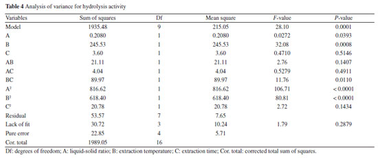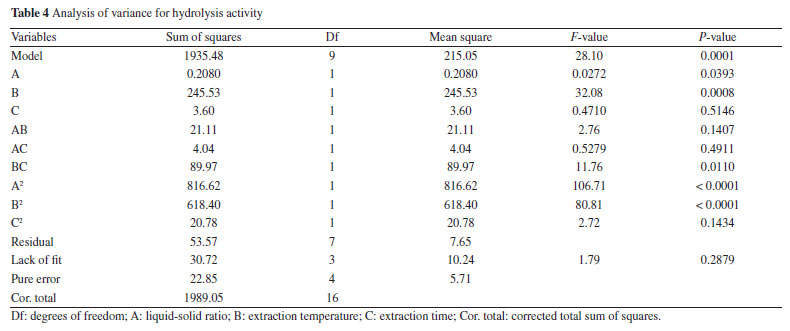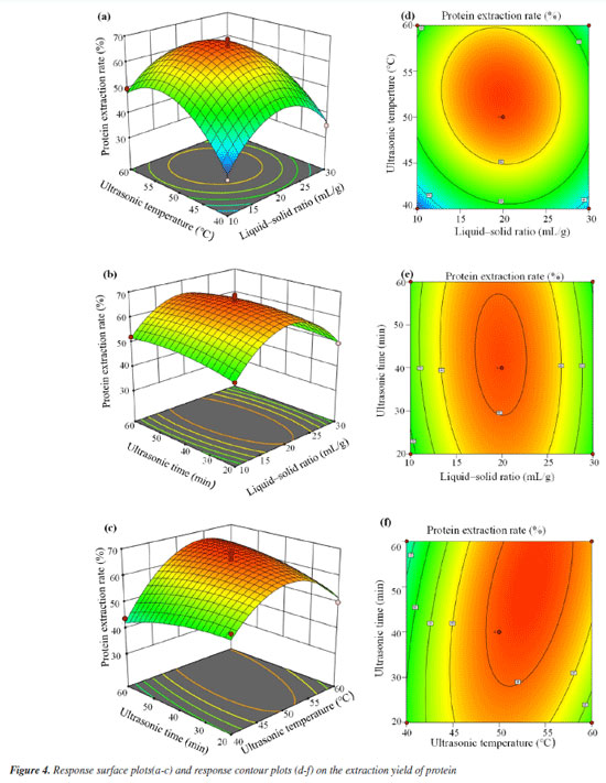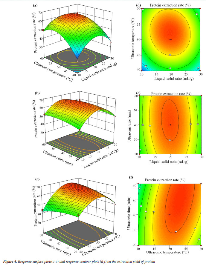 Effect of temperature The effect of temperature on protein extraction was investigated using a DES solvent. The experiments were conducted at temperatures ranging from 30 to 70 °C for 40 min under ultrasound. As shown in Figure 3b, the protein extraction rate initially increased with temperature, likely due to the reduction in viscosity and surface tension of the DES, which facilitated mass transfer and improved extraction efficiency. However, further increases in temperature resulted in a decline in extraction efficiency, possibly due to protein denaturation or hydrolysis. Effect of extraction time This study aimed to investigate the effect of extraction time on protein extraction efficiency using a DES solvent with ultrasonication at 50 °C. Extraction times ranged from 20 to 60 min. As shown in the Figure 3c, protein extraction efficiency increased with extraction time up to a certain point. However, excessive extraction time led to a decrease in efficiency, likely due to protein hydrolysis induced by prolonged ultrasonic exposure. Additionally, extended treatment may facilitate the extraction of other bioactive compounds, which could interfere with protein dissolution. Response surface optimization results To overcome the limitations of single-factor experiments in identifying interactive effects, the parameter ranges established in “Single-factor experiments” sub-section (derived from single-factor experiments) were used to design a BBD. The results of BBD study are shown in Table 3, and the model variance analysis is presented in Table 4. The overall P-value of the model is < 0.0001, indicating significance, while the P-value for lack-of-fit is > 0.05, confirming model validity. The coefficient of determination (R2) value is 0.9731, suggesting a good fit, and both the adjusted R2 (0.9384) and predicted R2 (0.7350) show high agreement, with a difference of less than 0.2, indicating the model's reliability (Figure 4).