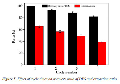 The P-values of the three independent variables demonstrate all exert a significant influence on the protein extraction rate. By means of data fitting, the regression equation for the protein extraction rate in relation to the three factors can be expressed as follows: ![]() where Y: the protein extraction rate, expressed as a percentage; A: the liquid-to-solid ratio, in mL g-1; B: the extraction temperature, in °C; C: the extraction time, in min. The Design-Expert 12 software (StatEase, USA) predicted optimal conditions for protein extraction as 26.38 mL g-1 (liquid-to-solid ratio), 52.24 °C, and 45.39 min (ultrasonication time), with a yield of 60.41%. For practical operability, parameters were adjusted to 25 mL g-1, 52 °C, and 45 min. Experimental validation under these adjusted conditions yielded an average extraction rate of 67.19 ± 1.24% (triplicate tests). The slight deviation (60.70% vs. 67.19%) likely stemmed from minor operational variations (e.g., temperature control and sample handling), confirming the model's applicability in practical extraction processes. Crucially, the close proximity between predicted and observed results, coupled with the high model validity metrics, confirms the BBD model's effectiveness in optimizing the extraction process within the parameter space identified by the foundational single-factor studies. Reusability of DES After the protein extraction process using DES, centrifugation was employed to separate the protein-rich phase from the crude DES extract. The supernatant was then subjected to reduced pressure to evaporate water and ethanol, allowing for the recovery of DES. This recovered DES was subsequently reused for additional protein extraction cycles from pumpkin seed meal (Figure 5). Following four cycles of this procedure, the recovery rate of DES was determined to be 82.05 ± 1.69%, while the protein extraction efficiency reached 38.96 ± 1.53%. These findings confirm the structural stability of DES, underscoring its suitability for multiple reuses in protein extraction processes. The observed reduction in extraction efficiency during cycles 3-4 primarily stems from progressive accumulation of non-protein impurities (e.g., lipids/polysaccharides) in recycled DES, which compete for hydrogen-bonding sites, coupled with slight compositional drift due to differential volatility of DES components during recovery.27