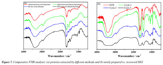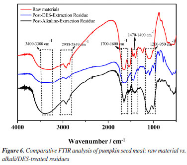 Structural characterization FTIR spectroscopy The chemical structural changes in pumpkin seed meal induced by alkali and DES treatments were analyzed via FTIR. As shown in Figure 6, characteristic absorption peaks were identified:28 (i) a broad peak at 3400-3300 cm-1 corresponding to O-H stretching vibrations, attributed to hydroxyl groups in polysaccharides or bound water in proteins; (ii) peaks at 2933-2849 cm-1 assigned to C-H stretching in aliphatic chains of lipids or protein side chains; (iii) a distinct peak at 1700-1600 cm-1 (amide I band) arising from C=O stretching vibrations in protein amide bonds, indicative of preserved α-helix/β-sheet secondary structures; (iv) peaks at 1470-1400 cm-1 (C-H bending) and 1200-950 cm-1 (C-O stretching), suggesting interactions with carbohydrates or lipids.29 Notably, the DES-treated residues retained a pronounced amide I band intensity, implying minimal protein denaturation, whereas alkali treatment reduced this signal, likely due to partial protein degradation.30 These results demonstrate that DES extraction maintains protein structural integrity more effectively than alkaline methods, aligning with its higher extraction efficiency observed experimentally.