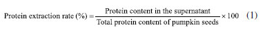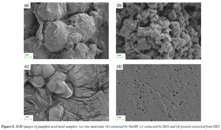 DES recycling and reuse The DES was recovered by evaporating ethanol under reduced pressure and reused for subsequent extraction cycles. The recovery rate and protein extraction efficiency were evaluated over four cycles. Fourier transform infrared spectroscopy (FTIR) FTIR analysis was performed using a WQF-600N spectrometer (Beijing Rui Li Analytical Instrument Co., Ltd.). Samples were mixed with KBr and pressed into pellets for analysis. Scanning electron microscopy (SEM) The microstructure of the pumpkin seed meal and extracted proteins was examined using a SEM (Hitachi SU8010, Japan). Samples were mounted on aluminum stubs using carbon tape and sputter-coated with gold to enhance conductivity. The SEM images were acquired at an accelerating voltage of 5 kV and a working distance of 10 mm. Hydrophilicity and hydrophobicity testing The water-holding capacity (WHC) and oil-holding capacity (OHC) of the extracted proteins were determined using standard methods.20