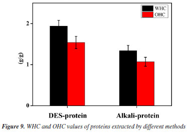 Hydrophilicity and hydrophobicity testing As shown in Figure 9, the protein extracted via choline chloride-urea deep eutectic solvent (DES) exhibited a significantly higher water-holding capacity (WHC, 1.94 g g-1) compared to alkaline-extracted protein (1.34 g g-1) (P < 0.05). The enhancement is attributed to DES' unique hydrogen-bonding network: urea acts as a hydrogen-bond disruptor, mitigating excessive protein aggregation while preserving hydrophilic domains. This aligns with the observation that DES maintains protein hydration shells better than ionic liquids.32 In contrast, alkaline extraction induced irreversible denaturation, exposing hydrophobic residues and reducing water-binding sites - a common limitation noted in legume protein extractions.33 The superior WHC suggests an optimized hydrophilic-lipophilic balance, positioning DES-extracted proteins as viable green alternatives for moisture-sensitive foods, with potential to reduce synthetic hydrocolloid usage.
