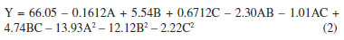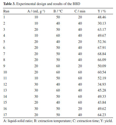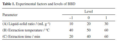 EXPERIMENTAL Materials Sunflower disk powder was purchased from Inner Mongolia Dingshang Jiaren Agricultural Technology Development Co., Ltd. Choline chloride, ethanol, citric acid, glycerol, urea, ethylenediamine, and potassium bromide (KBr) were obtained from Sinopharm Chemical Reagent Co., Ltd. Preparation of DES and single-factor experiments The DES was prepared by combining the hydrogen bond acceptor (HBA) and hydrogen bond donor (HBD) in specific molar ratios and stirring at 80 °C for 30 min to form a homogeneous, transparent liquid.16 The DES was then cooled to room temperature. The types of DES, molar ratios of HBA to HBD (2:1, 1:1, 1:2, 1:3), and water content (10, 20, 30, 40, 50 wt.%) were optimized to identify the most suitable solvent for extraction. Extraction procedures Protein extraction was conducted by treating 1.00 g pumpkin seed meal with 20.0 mL preheated DES (50 °C) via ultrasonication (300 W, 40 kHz, 50 °C, 40 min), followed by cooling, centrifugation (10,000 × g, 15 min, 4 °C) and supernatant collection. Total protein in raw material was determined by Kjeldahl method17 (N-to-protein factor = 6.25), while soluble protein in extracts was quantified using Coomassie Brilliant Blue method. Extraction yield was calculated using Equation 1: ![]() Protein separation and recovery The crude extract was mixed with anhydrous ethanol to precipitate the protein.18 The mixture was centrifuged at 10,000 rpm for 10 min, and the resulting precipitate was sequentially washed three times with 70% (v/v) ethanol and deionized water alternately (each wash was followed by centrifugation at 8,000 rpm for 5 min) to remove soluble impurities. Finally, the purified precipitate was freeze-dried to obtain the protein. Response surface optimization experiments A Box-Behnken design (BBD) was employed to optimize the liquid-to-solid ratio, extraction temperature, and extraction time.19 The experimental factors and levels are presented in Table 1.