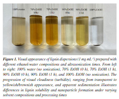 RESULTS AND DISCUSSION Visual stability and initial observations Figure 1 shows the visual aspect of the lignin dispersions prepared with different ethanol-water ratios and ultrasonication times. Samples ranged from 0 to 2 h of ultrasonic treatment in 70% ethanol, with additional controls using 100% water and 100% ethanol at 0 h. The sample prepared in pure water presented clear sedimentation and poor solubilization, consistent with the low aqueous solubility of lignin. In contrast, samples with 70% ethanol appeared well-dispersed, even without ultrasonication, indicating that this solvent ratio promotes spontaneous nanoparticle formation. The 90% ethanol sample also showed dispersion but with visible coloration differences, suggesting partial solubilization or aggregation behavior. The image was acquired 30 days after sample preparation, under 5000 K fluorescent illumination with automatic white balance.