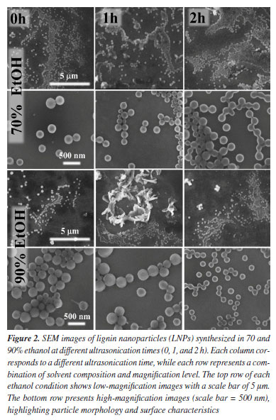 With increasing sonication time (1-2 h), samples in 70% ethanol maintained visual homogeneity and stability, indicating that ultrasonication assists in particle refinement without destabilizing the suspension. In 90% ethanol, dispersions initially formed with some sediment at the bottom, which could be redispersed upon mild shaking, pointing to moderate colloidal stability. These observations align with previous studies5,7 showing that solvent polarity plays a critical role in the solubility and self-assembly behavior of lignin macromolecules. Ethanol-water mixtures, particularly in intermediate proportions such as 70%, provide an optimal polarity range that enhances lignin dispersion and promotes nanoparticle formation via controlled supersaturation during solvent exchange. The better visual stability and homogeneity of 70% ethanol samples, even at 0 h, suggest that this solvent system is effective in promoting spontaneous assembly of lignin into colloidally stable structures. The 90% ethanol system, while also enabling particle formation, showed signs of lower solubility and sedimentation, likely due to reduced hydrogen bonding capacity and increased hydrophobicity. In general, lignin exhibits low solubility in polar solvents like water14 or in nonpolar solvents like hexane.15 Its cross-linked structure prevents it from dispersing easily, as the cross-links and the presence of hydrophobic groups hinder interaction with solvents of distinct polarities. A mixture of ethanol and water is effective in dissolving the lignin due to its intermediate solvent properties.14 Ethanol is an alcohol with both polar and nonpolar characteristics, allowing it to interact with different regions of lignin. Water, in turn, is highly polar and can stabilize the hydrophilic groups present in lignin.16 This combination can break the cross-links, and hydrophobic interactions present in lignin, facilitating its dissolution. Additionally, ethanol can solubilize the aromatic and hydrophobic parts,17 while water helps stabilize the hydrophilic regions,18 creating a favorable environment for dissolution. The mechanism involves the interaction of ethanol with the hydrophobic groups of lignin, penetrating its cross-linked structure, while water stabilizes the hydrophilic regions through hydrogen bonding. This combination reduces the energy interaction between the units of lignin, promoting its dispersion and dissolution. The fact that redispersion could be achieved with minimal agitation further supports the notion that these systems form kinetically trapped but reversible aggregates. Overall, these macroscopic observations provide preliminary yet strong evidence of solvent-driven control over lignin nanoparticle formation and stability. Morphological characterization by SEM and FTIR Representative SEM images (Figure 2) reveal the morphology of LNPs synthesized under selected conditions, specifically, 0, 1, and 2 h of ultrasonication in 70 and 90% ethanol (v/v) mixtures. For LNPs produced in 70% ethanol, the morphology was predominantly spherical with relatively smooth surfaces. At 0 h, particles appeared as larger and slightly polydisperse aggregates, while sonication for 1 and 2 h led to a clear reduction in size and a more homogeneous, monodisperse population. This suggests that ultrasonication facilitates disaggregation and fragmentation of lignin clusters, promoting the formation of uniform nanostructures in moderately polar media.10