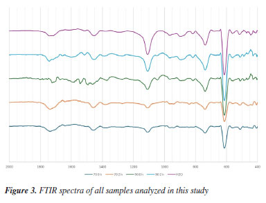 In contrast, the LNPs formed in 90% ethanol displayed greater morphological heterogeneity. After 2 h of sonication, the particles appeared smaller and more defined; however, they remained more irregular than those from the 70% ethanol system. This behavior may stem from the reduced polarity and hydrogen bonding capacity of 90% ethanol, which hinders full solubilization of lignin and facilitates uncontrolled precipitation into irregular structures. These morphological differences are consistent with reports in the literature highlighting the importance of solvent polarity and supersaturation in the nanoprecipitation process. Intermediate ethanol-water mixtures, such as 60-80%, have been shown to provide optimal conditions for lignin self-assembly into spherical nanoparticles due to a balanced rate of nucleation and growth.5,7 The presence of water helps maintain a degree of hydrogen bonding with hydrophilic groups in lignin, while ethanol modulates the hydrophobic interactions required for aggregation. In high ethanol content (90% or above), the reduced dielectric constant and solvation capability can lead to abrupt supersaturation and rapid precipitation, often resulting in less controlled particle morphologies. Moreover, the observed improvements in particle regularity and surface smoothness with increasing ultrasonication time align with previous studies12 demonstrating that ultrasonic energy not only promotes dispersion but can also induce cavitation effects that facilitate the breakup of larger lignin domains into nanoscale units. However, excessive sonication may also cause localized heating or secondary aggregation, which should be considered in future optimization studies. Overall, SEM analysis confirms that both solvent composition and ultrasonic processing play significant roles in determining the morphology of LNPs. The 70% ethanol system appears particularly favorable for producing well-defined, spherical, and uniform nanoparticles with minimal processing steps and no chemical modification, what is an important aspect for scalable green synthesis. The FTIR spectra of the samples are shown in Figure 3. In the spectral region from 400 to 1400 cm-1, no significant chemical differences were observed, aside from minor fluctuations; the sole exception was a slight increase in the intensity of the band at 870 cm-1 in samples prepared with 90% ethanol, which is attributed to aromatic C-H out-of-plane deformations.19 In the higher wavenumber range, a differentiated behavior was noted: the band at 1460 cm-1, corresponding to CH2 and CH3 bending vibrations in aliphatic side chains, exhibited stronger absorption in samples prepared with 70% ethanol, whereas the band near 1600 cm-1, associated with the C=C stretching of aromatic rings,20 was more intense in the 90% EtOH samples.