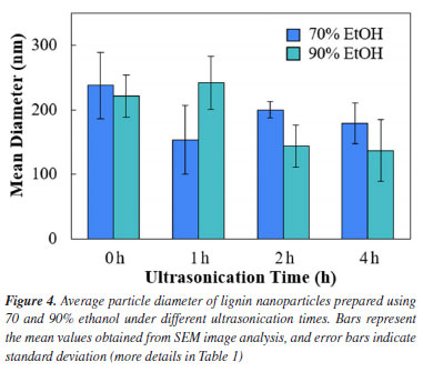 CONCLUSIONS In this study, we demonstrated a simple and eco-friendly method for producing LNPs using only ethanol-water mixtures and ultrasonication, without the need for surfactants, toxic solvents, or chemical modifications. The results highlight the influence of both solvent composition and sonication time on nanoparticle formation, size, and morphology. Particularly, 70% ethanol promoted spontaneous nanoparticle formation with good stability and spherical morphology, while 90% ethanol required longer sonication to achieve similar results, suggesting different nanoprecipitation mechanisms governed by solvent polarity. The current findings provide additional understanding of how solvent polarity and sonication conditions influence lignin nanoparticle formation using a minimalistic green approach. By avoiding toxic solvents, surfactants, or chemical modifications, the methodology simplifies the synthesis process and also aligns with circular economy and green chemistry principles. Moreover, this simplified system serves as a platform for more in-depth studies, including kinetic modeling of nanoparticle growth, surface chemistry analysis, and long-term performance evaluation. The ability to achieve tunable particle sizes and stable colloidal suspensions using only ethanol and water positions this method as a viable alternative for the sustainable production of bio-based nanomaterials. Future studies by our group are expanding upon these results by investigating a broader range of solvent ratios, lignin concentrations, and ultrasonication conditions, as well as employing more advanced characterization techniques to deepen the understanding of nanoparticle properties and functionality. Together, these efforts aim to support the development of lignin-based nanomaterials for applications in packaging, biomedicine, and other fields demanding sustainable and scalable nanotechnologies.