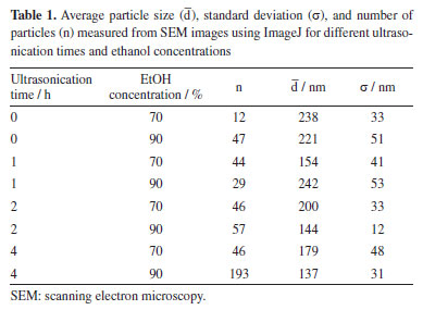 EXPERIMENTAL Materials Kraft lignin (alkali, low sulfonated), obtained from Sigma-Aldrich, was used without further purification. Ethanol (≥ 99.5%, analytical grade) was purchased from Vetec and used as received. Ultrapure water (resistivity 18.2 MΩ cm) was obtained using a Milli-Q purification system. All reagents were handled under ambient laboratory conditions. Preparation of lignin nanoparticles via solvent exchange LNPs were synthesized using an environmentally friendly nanoprecipitation approach involving ethanol-water solutions at two different volume ratios 70:30 and 90:10 (ethanol:water, v/v), to investigate the influence of solvent polarity and structuring on nanoparticle formation. In each experiment, 20 mg of lignin were added to 20 mL of ethanol-water solution resulting in a final concentration of 1 mg mL-1. For all formulations, the solvent mixture was prepared prior to lignin addition, and the solid lignin powder was directly introduced into the solution. The dispersions were magnetically stirred for 20 min to promote dissolution and partial solubilization of lignin aggregates. No surfactants, pH adjustments, or chemical additives were used throughout the process, distinguishing this procedure from more complex or chemically-intensive methods reported previously. The final samples were let to decant for 24 h and then poured in a silicon wafer for SEM analysis. Ultrasonication was employed to assist nanoparticle control and reduce particle size. Samples were subjected to ultrasonic treatment using a sonicator bath Quimis 03/350 operating at 40 kHz and 160 W. Sonication was performed for up to 2 h under ambient temperature, while control samples were maintained under magnetic stirring alone (0 h ultrasonication). All dispersions were subsequently stored in falcon tubes for further analysis. Characterization of LNP dispersions Visual analysis and stability observation Immediately after preparation, all LNP suspensions were visually inspected to evaluate clarity, ranging from transparent to yellowish/brownish appearance, and initial sedimentation behavior. The vials were left undisturbed at room temperature, and periodic observations were recorded to monitor the onset of sedimentation or aggregation over time. Photographic documentation was obtained before and after homogenization to compare redispersibility and stability, with visual indicators of particle sedimentation used as a practical measure of colloidal behavior. Photographic documentation was performed 30 days after sample preparation using 5000 K fluorescent lighting and automatic white balance settings to ensure consistent visual conditions. Scanning electron microscopy (SEM) Morphological analysis of the lignin nanoparticles was carried out using scanning electron microscopy. A 1 cm2 piece of silicon wafer was cleaned with isopropyl alcohol, and 10 µL of the nanoparticle suspension were pipetted onto the surface and allowed to dry overnight at room temperature. SEM images were acquired using a field emission SEM system Magellan 400-FEI, operating at an accelerating voltage of 5-10 kV. Morphological differences between particles formed in 70 and 90% ethanol systems, with and without ultrasonication, were analyzed in terms of size, shape uniformity, and degree of aggregation. Fourier transform infrared spectroscopy (FTIR) Infrared spectra were performed on a Shimadzu IR-Tracer 100 Fourier transform infrared spectrometer using direct transmission. The spectra were collected in the range of 4000 to 400 cm-1 with 45 scans and 4 cm-1 resolution. Three spectra were collected for each sample, and the average spectrum was used for analysis. Characterization of particle size analysis via image processing Particle size distribution was evaluated by processing SEM images using ImagePro Plus 6.0 (Media Cybernetics, Rockville, USA), although the approach is applicable to similar image analysis software. Calibration was performed based on the scale bar embedded in each image. Each complete particle was manually counted, with measurements taken twice per particle along perpendicular diameters to ensure accuracy. In cases where particles were conjoined, individual particles were distinguished and counted separately. Manual correction was applied when particle boundaries were ambiguous due to aggregation, charging effects, or shadowing in the micrographs. The collected diameter measurements were then used to calculate the mean particle size and standard deviation for each experimental condition. While this method requires more effort than dynamic light scattering (DLS), it provides greater accuracy for irregularly shaped particles and enables more reliable comparisons between samples.