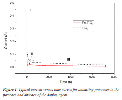 RESULTS AND DISCUSSION During all the anodization, the current versus time profile was monitored. Typical curves obtained are shown in Figure 1. The addition of the doping agent to the working electrolyte promoted a slight reduction in the current overtime. The behavior of the curves representing the growth of the anodic films agrees with that described in the preexisting literature.3,10,17,18 The prominent peaks observed in the first seconds of anodization (stage I) indicate the formation of a compact oxide film. At this point, the current reaches its maximum and drops very fast. This happens because the growth of the anodic layer difficulties the current circulating. In stage II, nanopores are formed due to the interactions of TiO2 with the F- ions, leading to the formation of [TiF6]2-. It can be noted that in this stage the current increases slightly due to the increase in surface area. In stage III, the current stabilizes due to the self-organization of the nanopores and the growth of nanotubes.