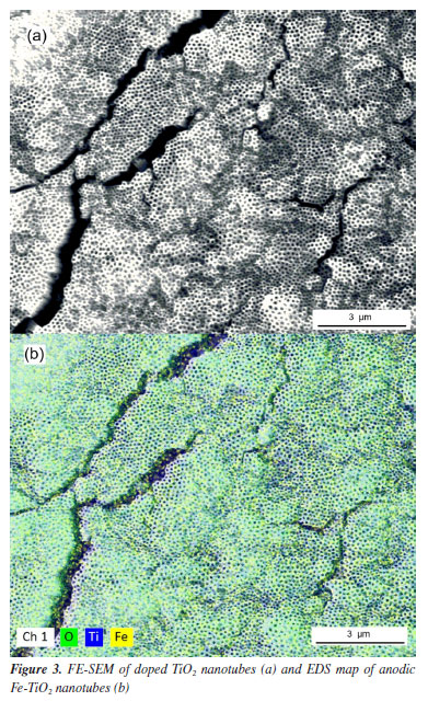 CONCLUSIONS It is possible to obtain TiO2 and Fe-TiO2 nanotubes through electrochemical anodization without and with in situ doping using a potential of 48 V and an anodization time of 120 min. The addition of iron ions in the working electrolyte promotes a slight reduction in the current during the anodization process. Fourier transform infrared spectroscopy analyses were not sufficient to prove the presence of iron in the doped TiO2 nanotubes. The same can be said for X-ray diffraction. However, the presence of iron in the doped samples was observed by energy dispersive spectroscopy, which showed a content of 1.69 at.%. X-ray diffractograms indicate that TiO2 and Fe-TiO2 nanotubes have the anatase phase. At the nanoscale, this phase has greater stability and favors photocatalytic processes. Iron doping alters some morphological attributes of TiO2 nanotubes. It was observed that the internal diameter of the nanotubes and the thickness of the anodic film are smaller in the Fe-TiO2 samples, however, doping did not alter the thickness of the nanotube wall. The influence of iron doping on morphology can be attributed to the low availability of F- ions in the reaction medium. This may occur because the ionic iron present in the electrolyte binds to the fluoride-generating FeFn3-n. Doping did not cause variations in the band gaps of the samples, since the average values found are statistically equal: 2.962 ± 0.107 eV for the Fe-TiO2 and 3.057 ± 0.049 eV for the TiO2. The photoelectrochemical performance of Fe-TiO2 was slightly superior to that of TiO2. However, the results may not reflect the real photocatalytic capacity of the samples, since the band gaps were found to indicate that they are photoactive only in the UV region, and the photocatalytic measurements were performed mainly in the visible region.