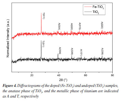 The crystallinity of the samples and the phase composition can be evidenced in the X-ray diffractograms showed in Figure 4. In both samples, the peaks of the metallic phase of titanium (011) and the anatase phase (004, 020, and 220) were identified at angles of 25.30°, 37.79°, 48.36°, and 70.23°, respectively. Furthermore, in the Fe-TiO2 sample, a peak (015) was identified at 53.89°, and in the undoped sample, a peak (121) was verified at 55.06°, both peaks corresponding to the anatase phase of TiO2. Although rutile is considered the most stable phase for extended systems, at the nanoscale the anatase phase has greater stability and favors charge transport, benefiting photocatalytic processes.21